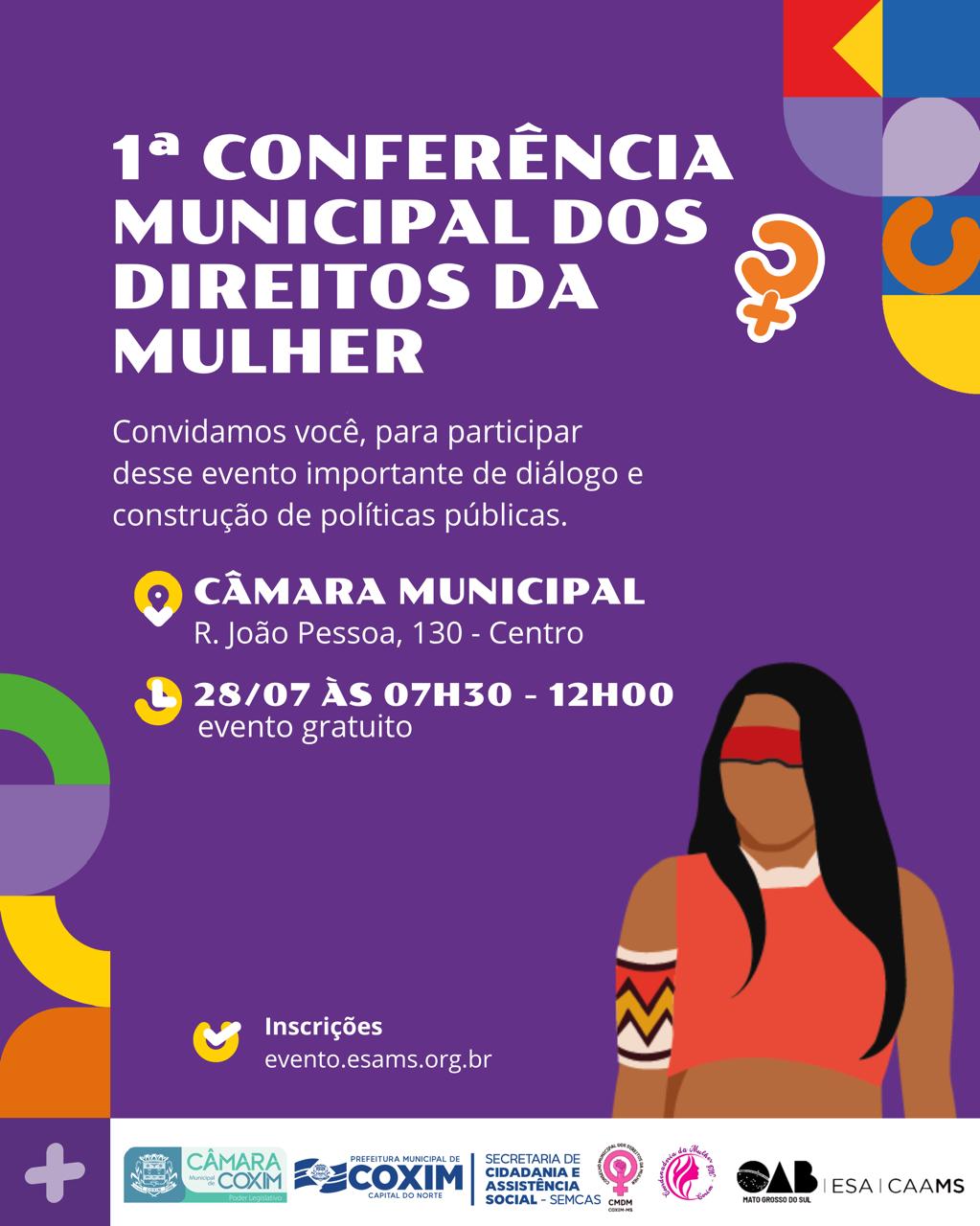 Nesta segunda-feira, dia 28 de julho, Coxim sediará um evento inédito e de grande relevância para a pauta feminina: a 1ª Conferência Municipal dos Direitos da Mulher. O encontro acontecerá das 07h30 às 12h00, na Câmara Municipal, localizada na rua João Pessoa, 130 – Centro, com entrada gratuita e inscrições abertas pelo site http://evento.esams.org.br.