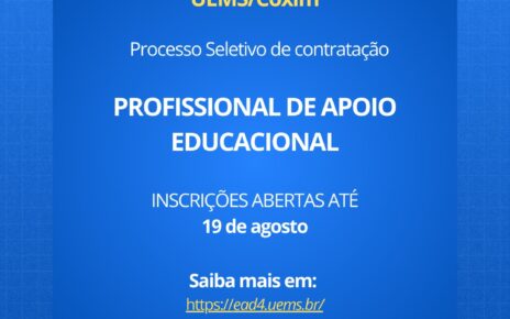Por: Gisleine Rodrigues/UEMS A Universidade Estadual de Mato Grosso do Sul (UEMS) por meio da Pró-Reitoria de Desenvolvimento Humano e Social (PRODHS) e da Pró-Reitoria de Ações Afirmativas, Equidade e Permanência Estudantil (PROAFE) está com inscrições abertas para o processo seletivo simplificado de contratação de Profissional de Apoio Educacional, para o serviço de apoio de […]