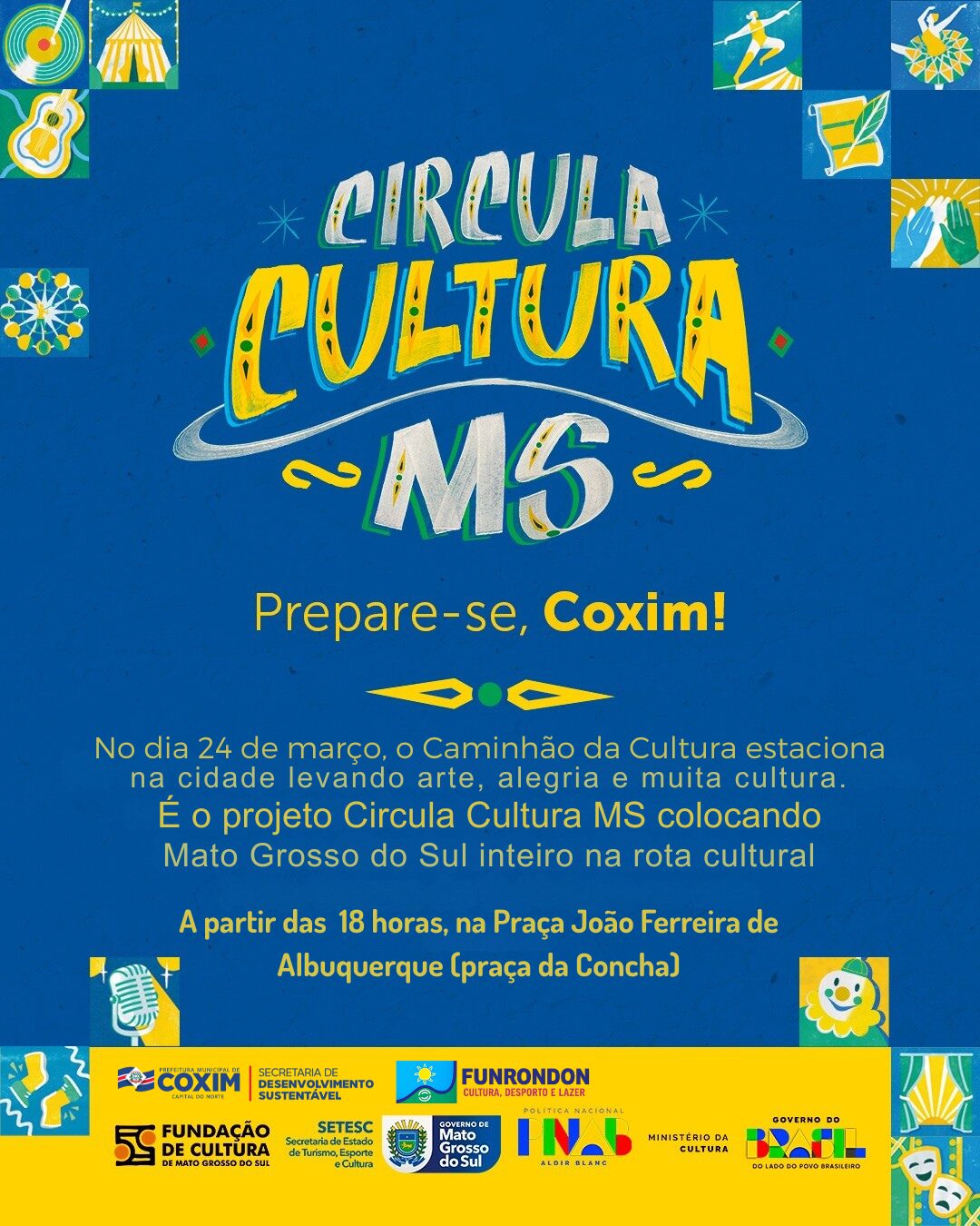 Na próxima terça-feira, dia 24 de março, o município de Coxim recebe o projeto “Circula Cultura MS”, uma iniciativa estratégica do Governo do Estado de Mato Grosso do Sul, executada pela Fundação de Cultura (FCMS). O evento, que integra a programação oficial em comemoração aos 128 anos de emancipação política de Coxim, terá como palco a “Carreta da Cultura”, uma unidade móvel estruturada para oferecer apresentações gratuitas de diversas linguagens artísticas.