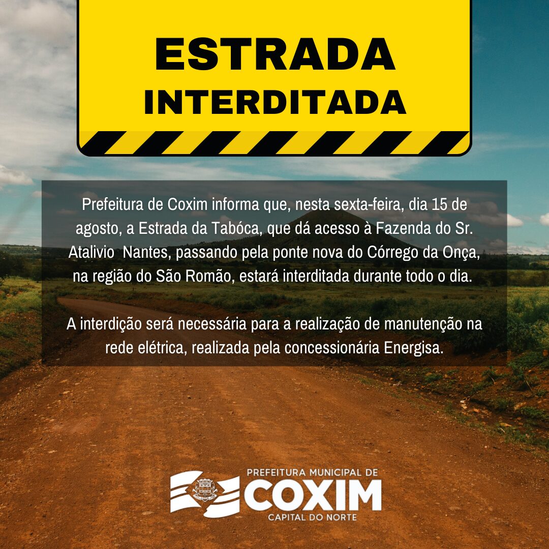 Prefeitura de Coxim informa que, nesta sexta-feira, dia 15 de agosto, a Estrada da Tabóca, que dá acesso à Fazenda do Sr. Atalivio Nantes, passando pela ponte nova do Córrego da Onça, na região do São Romão, estará interditada durante todo o dia.