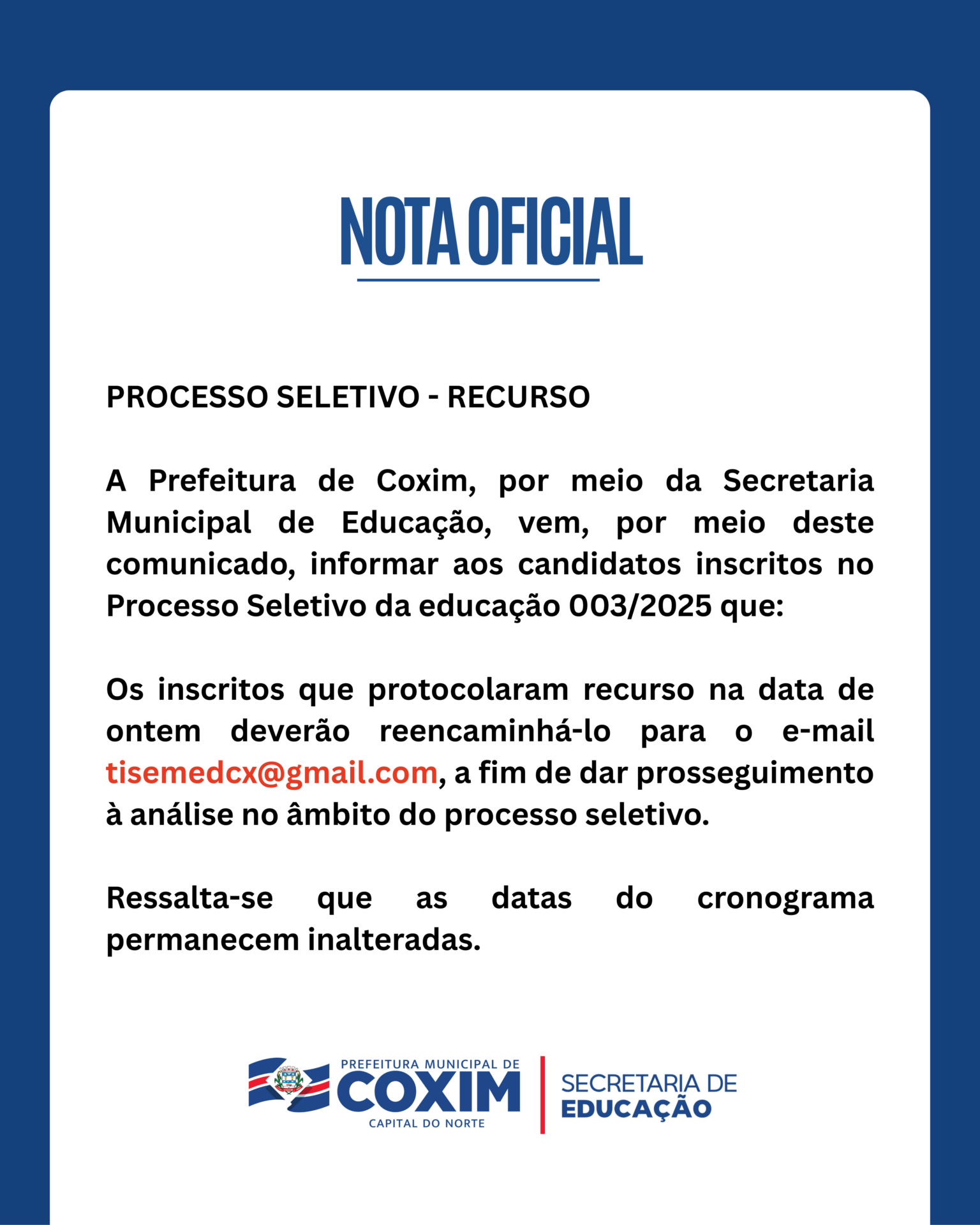 Nota Oficial – Processo Seletivo 003/2025 Educação Concurso Divulgação Processo Seletivo 7 de janeiro de 2026 Augusto Marques