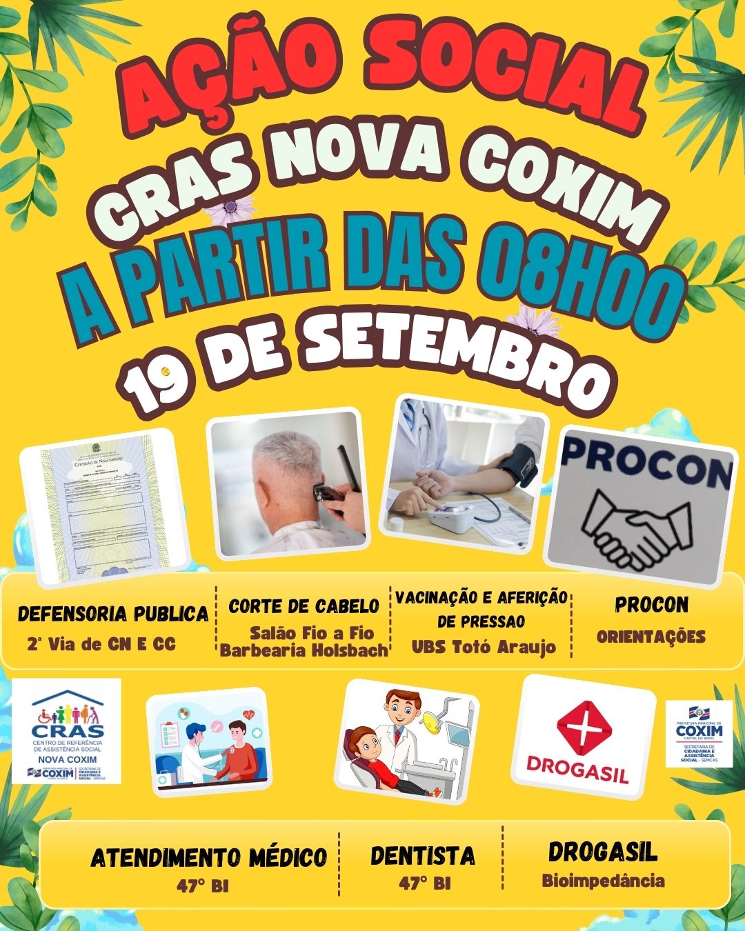 Nesta sexta-feira, dia 19 de setembro, a partir das 8 horas, o Centro de Referência de Assistência Social (Cras) Nova Coxim promove uma ação social com diversos atendimentos gratuitos à população.