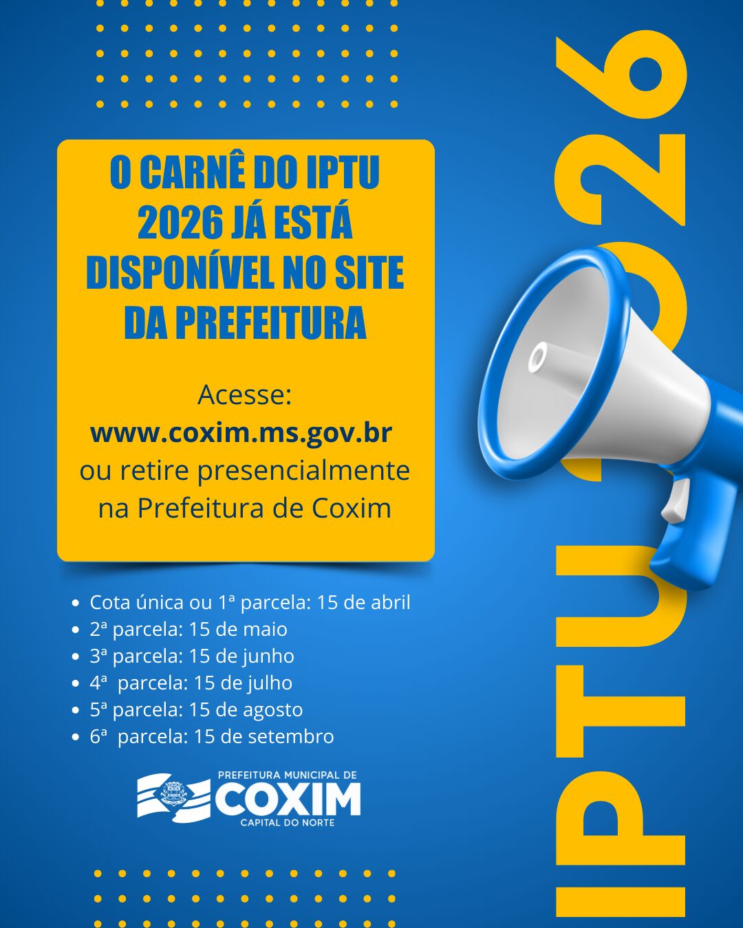 A Prefeitura Municipal de Coxim informa que os carnês do Imposto Predial e Territorial Urbano (IPTU) referentes ao exercício 2026 já estão disponíveis para retirada. Os documentos podem ser acessados de forma online, através do site oficial da Prefeitura, www.coxim.ms.gov.br, ou presencialmente na sede do Executivo Municipal, diretamente na Gerência de Receitas e Tributos.