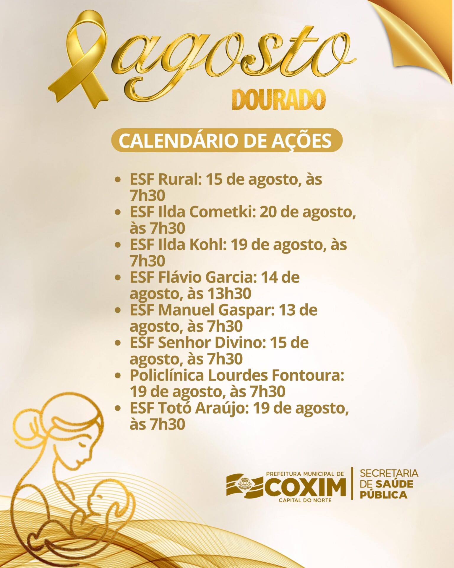 Para mais informações sobre o Agosto Dourado e o calendário de ações, procure a unidade de saúde mais próxima ou entre em contato com a Secretaria de Saúde Pública de Coxim.