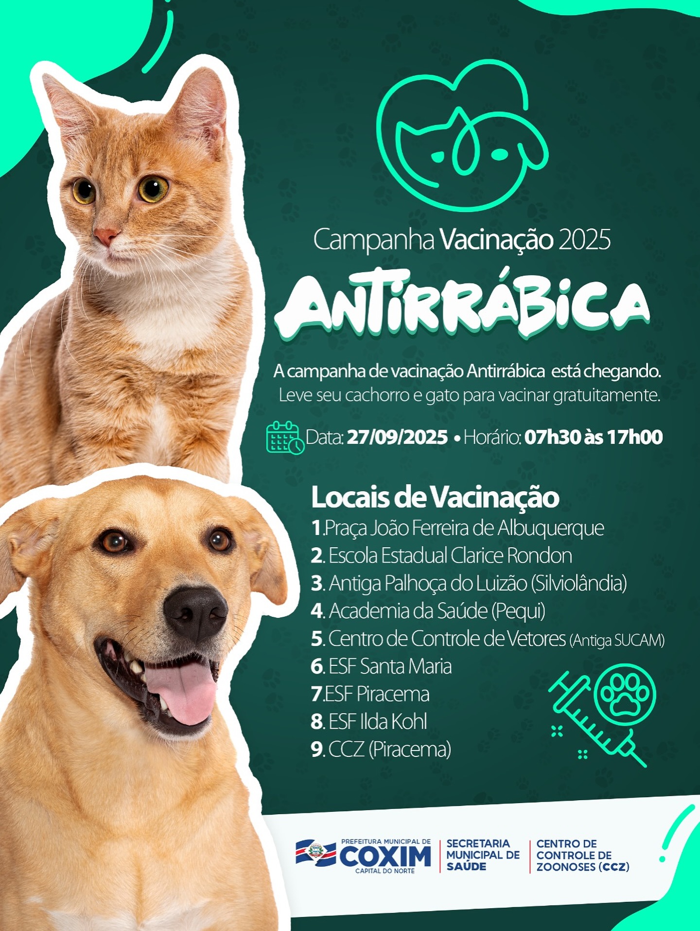 A Prefeitura Municipal de Coxim, por meio da Secretaria de Saúde e do Centro de Controle de Zoonoses (CCZ), convoca todos os moradores para uma grande mobilização em prol da saúde dos animais e da comunidade: a Campanha de Vacinação Antirrábica 2025. No próximo sábado, dia 27 de setembro, das 7h30 às 17h, nove pontos da cidade estarão preparados para vacinar gratuitamente cães e gatos contra a raiva.