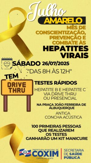 A campanha “Julho Amarelo”, que marca o mês de conscientização, prevenção e combate às hepatites virais, terá uma ação especial em Coxim. Neste sábado, dia 26 de julho, das 8h às 12h, a população poderá realizar testes rápidos para detecção de hepatites B e C de forma totalmente gratuita.